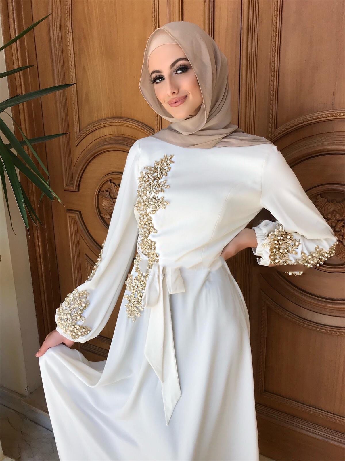 Cette robe musulmane de soirée est brodée avec précision et soin. Les motifs floraux traditionnels sont réalisés avec des fils dorés et argentés, reflétant la lumière avec subtilité. Ce caftan moderne puise ses inspirations dans les vêtements islamiques de Turquie, les abayas de Dubaï et les robes indiennes portées lors de grandes occasions.