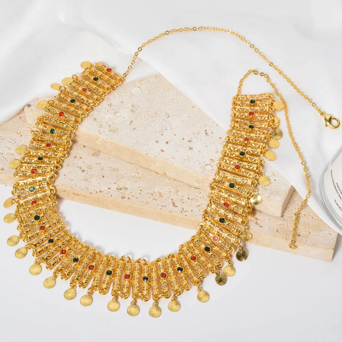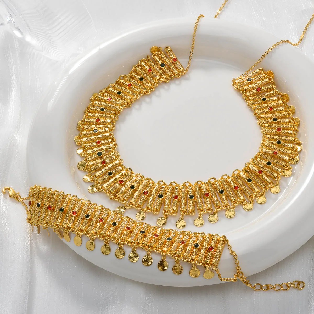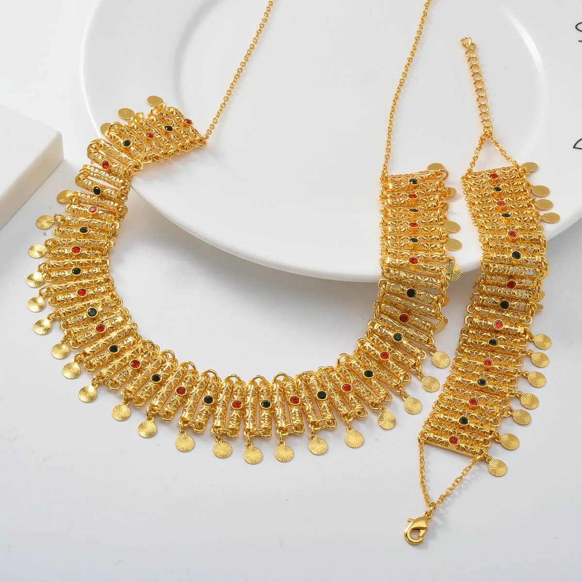 Dès le premier regard, cet ensemble séduit par son éclat maîtrisé. Le collier à maillons travaillés apporte une présence élégante au cou, tandis que le bracelet assorti complète la tenue avec équilibre. Ensemble, ils créent une harmonie parfaite, idéale pour sublimer une abaya élégante, un hijab fluide ou une tenue festive de Ramadan ou de Eid.